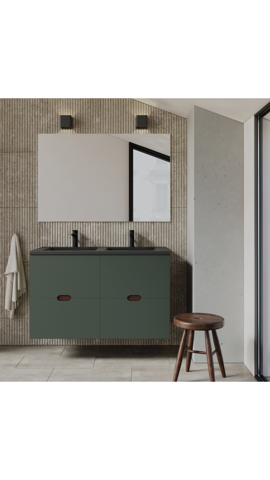 Ombras rena linjer och rymliga lådor ger dig massor av förvaring där du kan stuva undan hårborstar och makeup som annars kan stöka till på bänkskivan. Lägg till högskåp för handdukar och annat för att fullända looken.