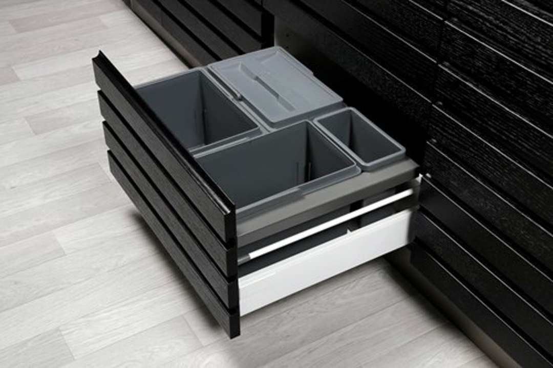 Köksavfallshanteringssystem kan även fås som kompletta insatser till lådor, där all sortering sker på samma ställe. Dessa sopkärl är idealiska för köket eftersom de är undanstoppade men ändå lätta att komma åt.