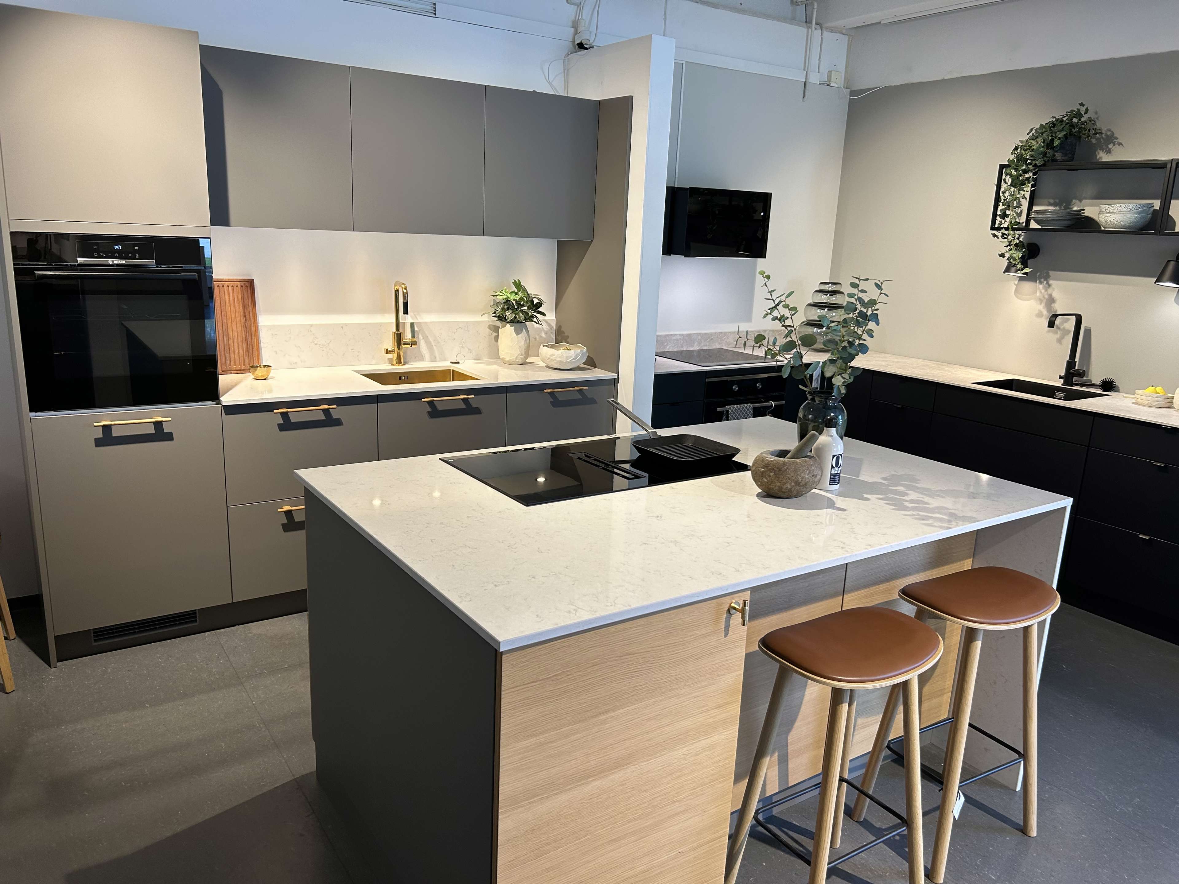 Vi säljer ut detta exklusiva utställningskök - fin kombination av Bordo London Grey och Veda Light Oak med kompositskiva, White Sky med vattenfall.