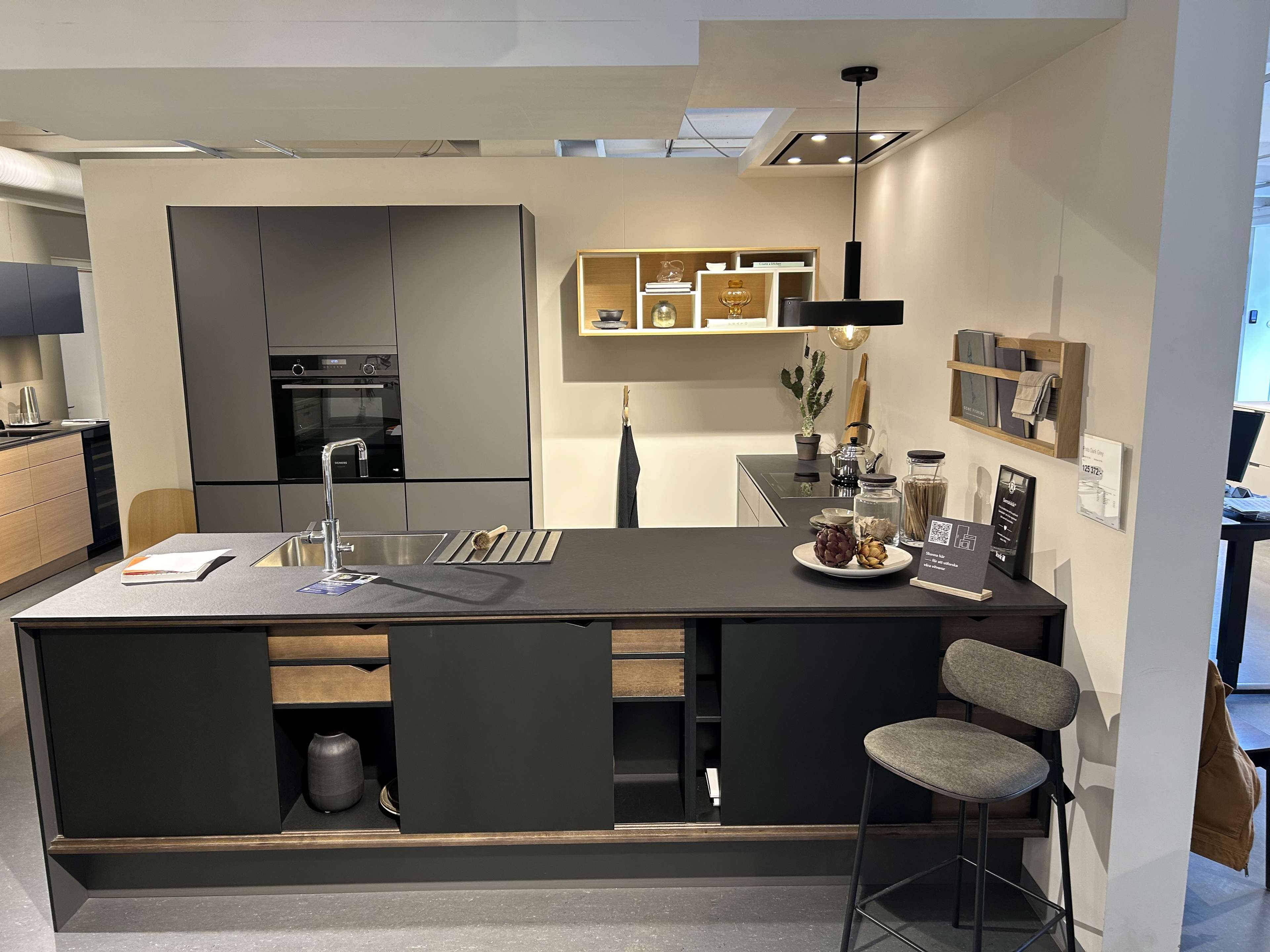 Handtagslös, strikt design i mörk grafit, svarta detaljer. Folierade fronter. Praktiskt högskåp med utdrag där man kommer åt hyllorna från båda sidor.