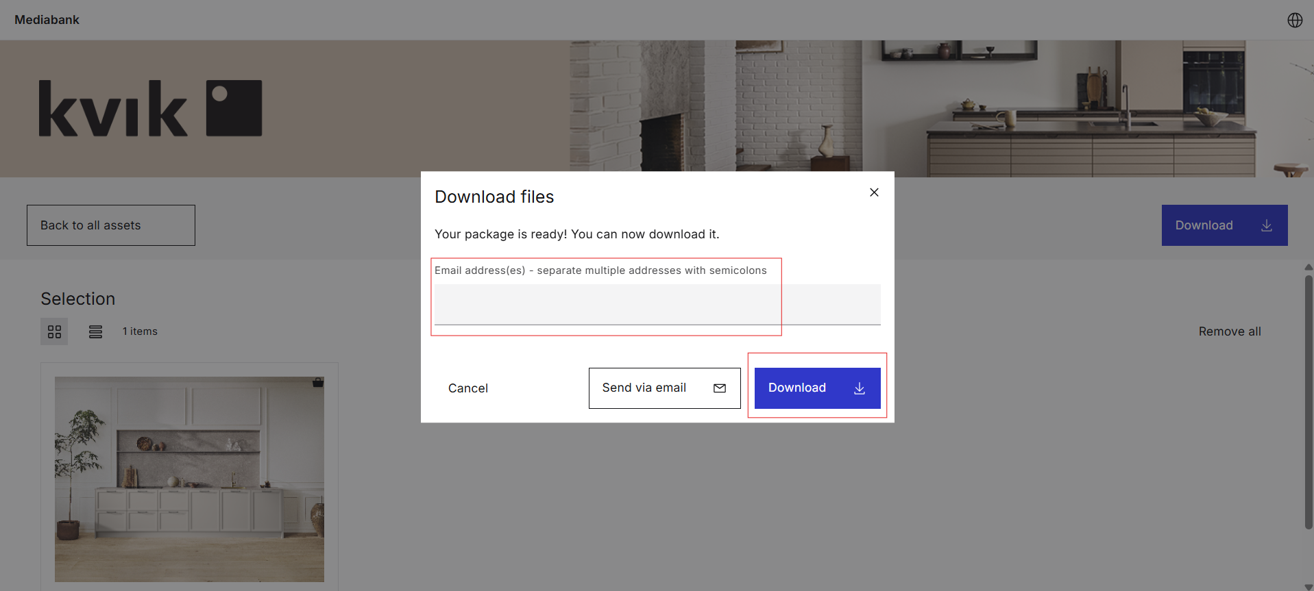 Välj nu om du vill att tillgångarna ska laddas ner direkt till din enhet eller skickas till din e-post.