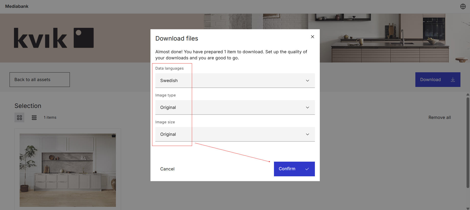 Innan du laddar ner dina tillgångar ombeds du att bekräfta nedladdningen. Klicka återigen på nedladdningsikonen som är markerad nedan: