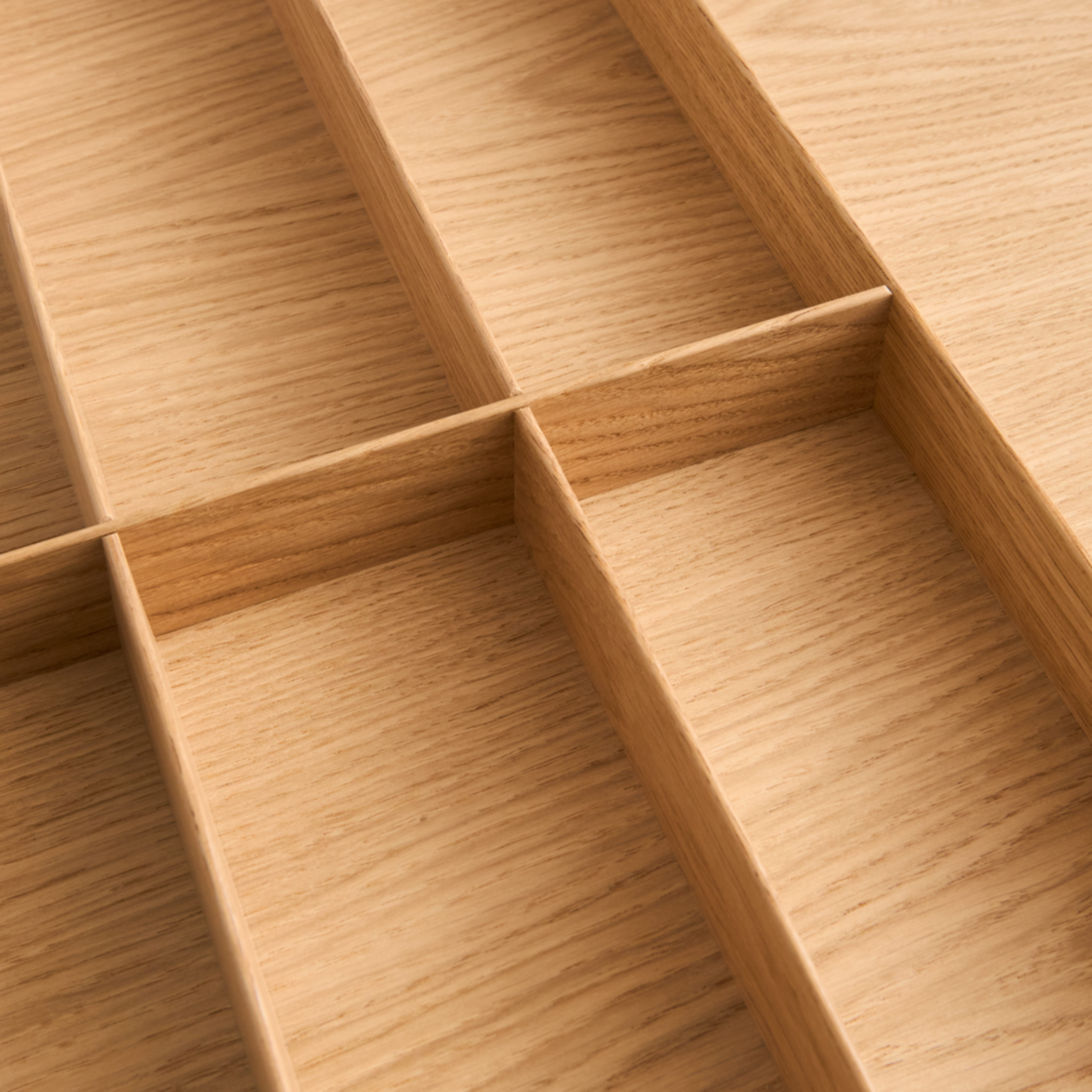 - Premiummaterial i ek. Vår bestickinsats är tillverkad av hållbar ek, vilket garanterar lång livslängd och ett tidlöst utseende som kompletterar alla köksinredningar.