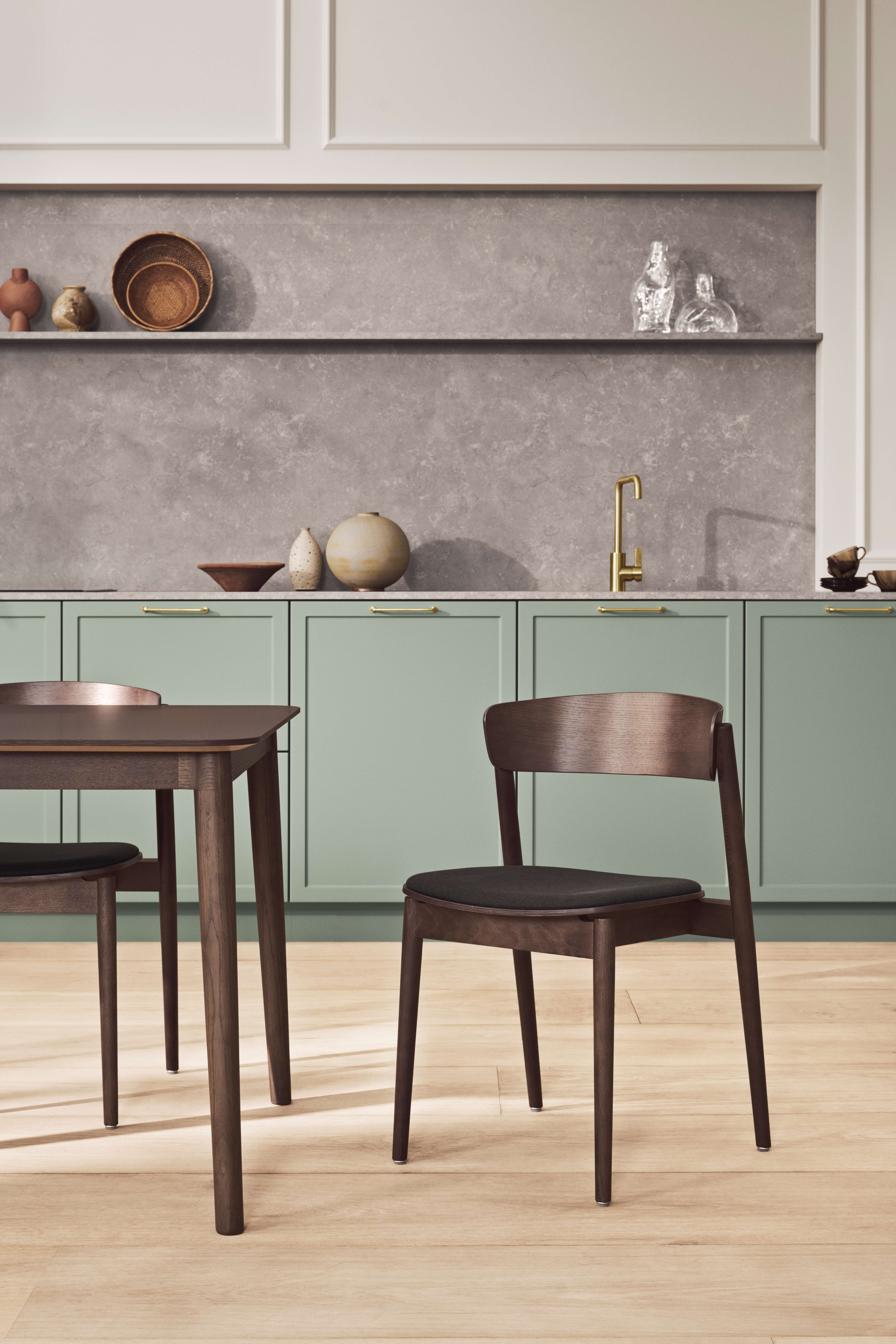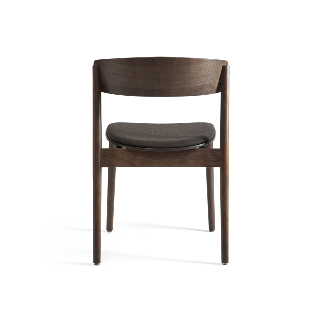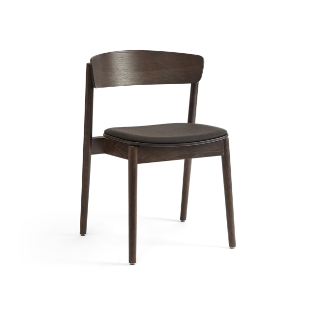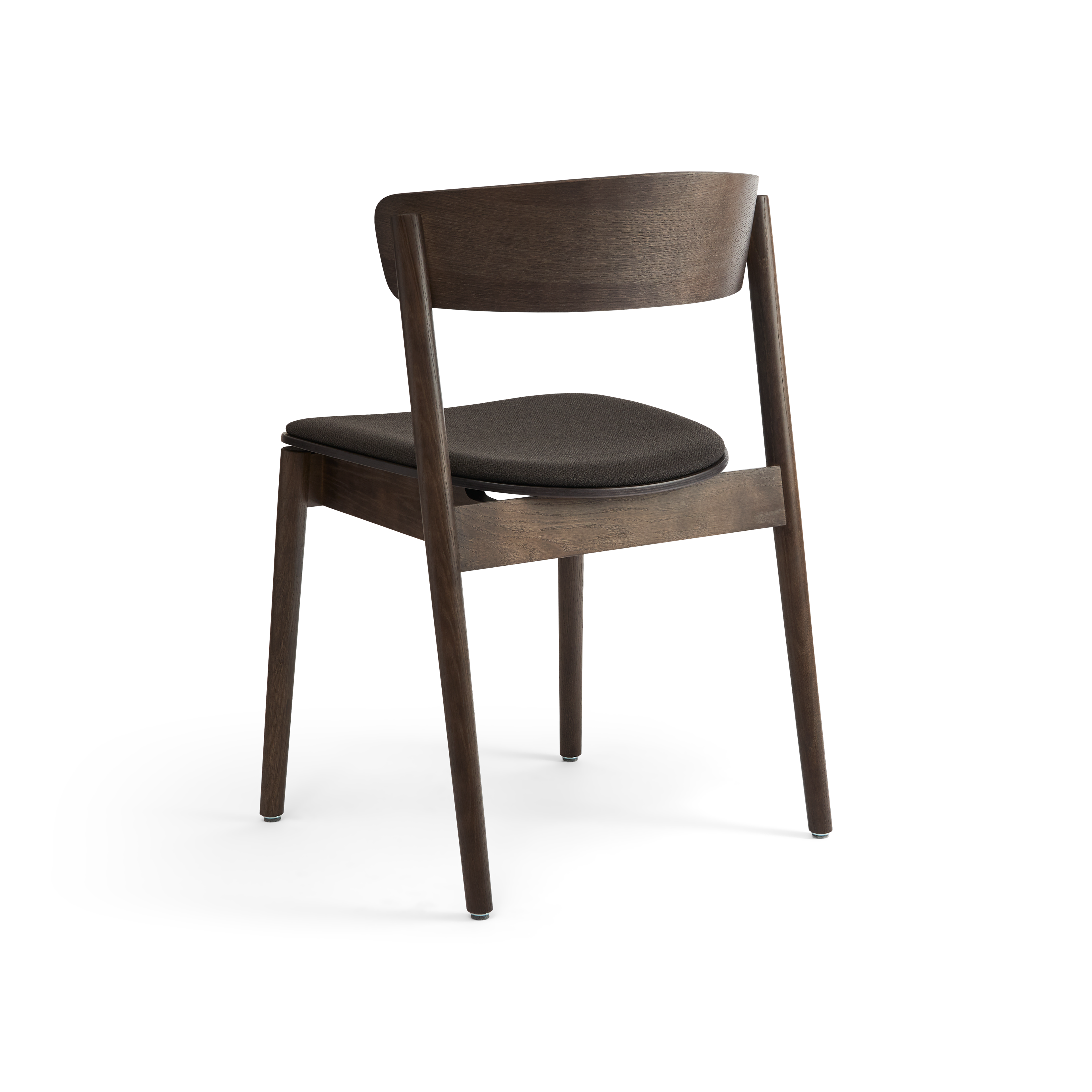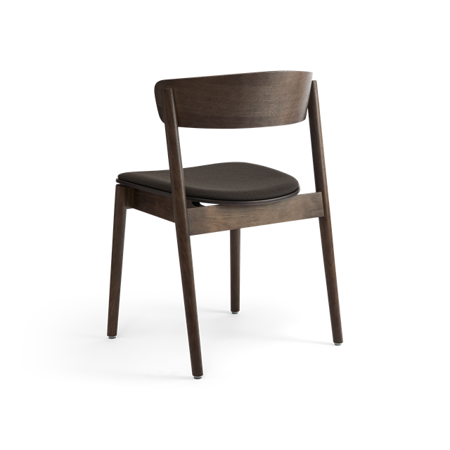 Denna stol representerar essensen av dansk design. Vackert hantverk, vågade designelement och samtidigt enkelhet som helhet. Att designa en stol är varje designers dröm och mardröm. Här möts design, ergonomi och hållbarhet. Utan bra komfort och styrka har en vacker design inget värde. Med denna stol, designad av Hans Thyge & Co., får du alla tre delarna. Designen kretsar kring det eleganta ryggstödet och de vinklade benen. Stolen lutar sig nästan mot bordet. Oftast ser man en stol bakifrån när den står vid matbordet, och det är också här designen har sitt mest fascinerande karaktärsdrag. Det stora ryggstödet ger hög komfort, men det är inte bara ryggen som finner vila här. Även armbågarna kan få stöd på ryggstödets sidor – en överraskande egenskap för en stol utan armstöd. När måltiden är över och du vill sitta avslappnat, ger det stora ryggstödet möjlighet till flera bekväma sittpositioner – vare sig du sitter helt upprätt eller lutar dig bakåt med benen i kors. Stolen är tillverkad i massiv ek och ekfanér, FSC®-certifierad. Finns i versioner med eller utan stoppning. Tyget i den stoppade versionen är tillverkat av 100 % återvunnen polyester. Stoppningen sitter på en separat och avtagbar platta, vilket gör det enkelt att underhålla och uppdatera stolen efter lång användning. Levereras inklusive filtglidare av högsta kvalitet.
