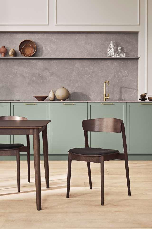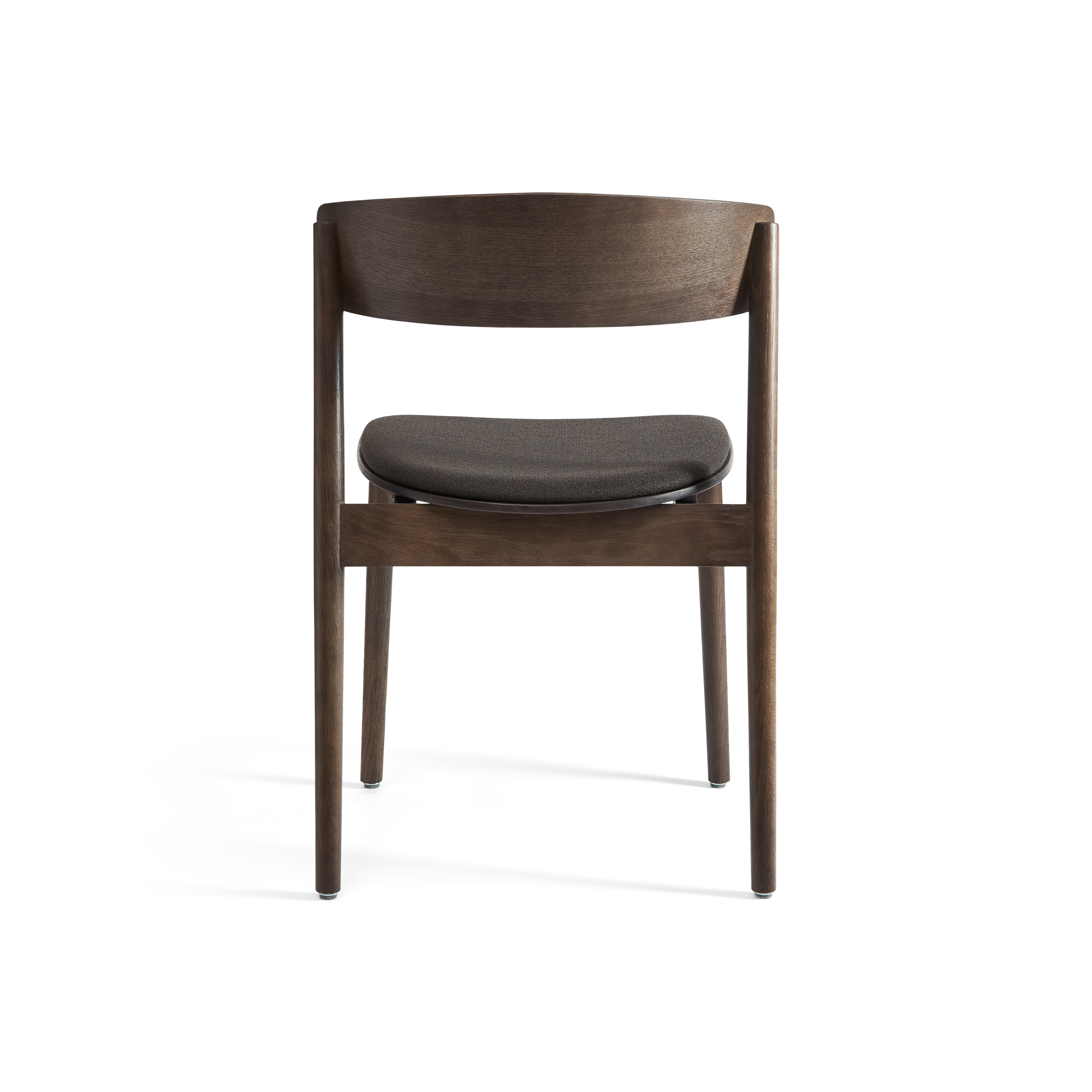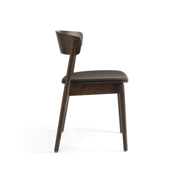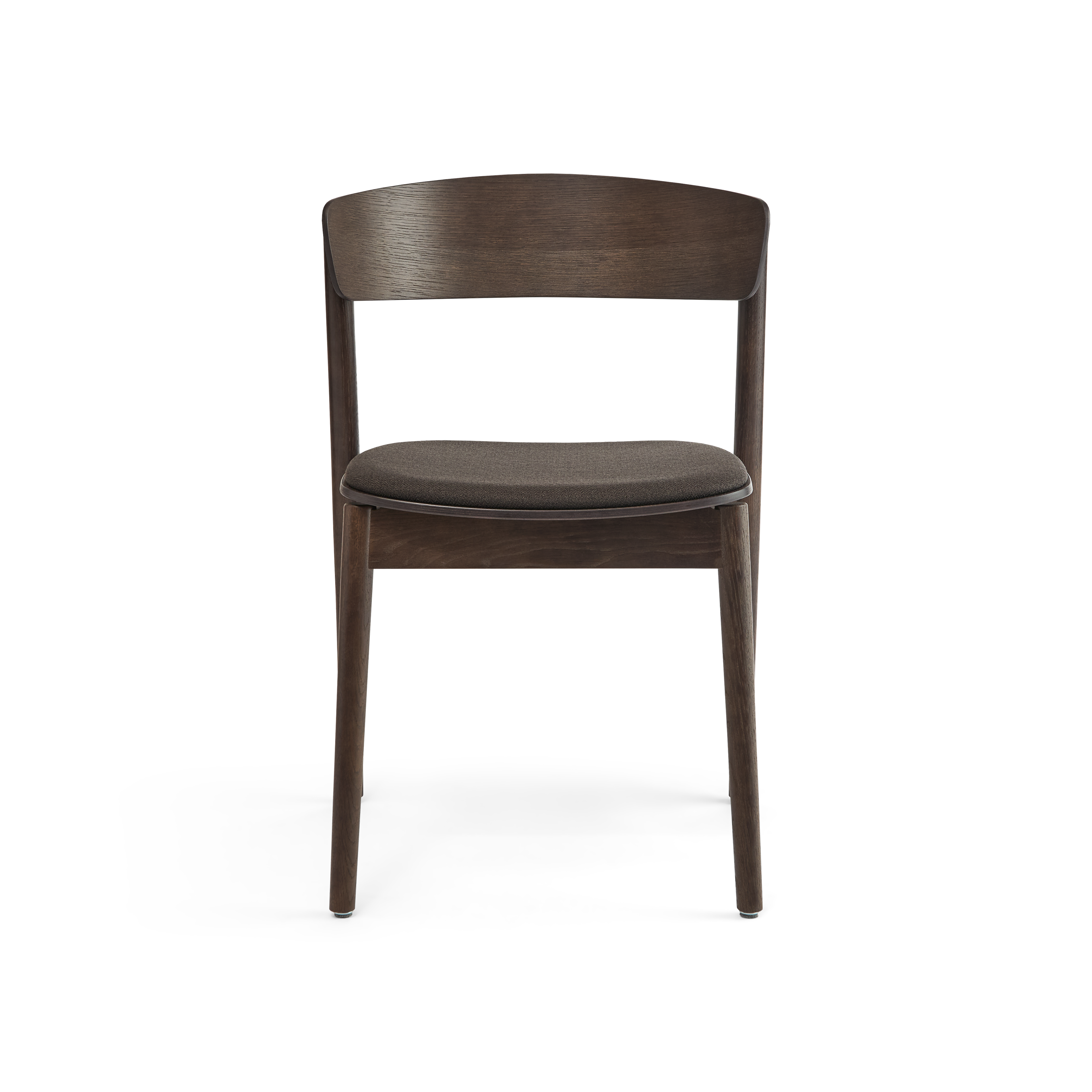 Denna stol representerar essensen av dansk design. Vackert hantverk, vågade designelement och samtidigt enkelhet som helhet. Att designa en stol är varje designers dröm och mardröm. Här möts design, ergonomi och hållbarhet. Utan bra komfort och styrka har en vacker design inget värde. Med denna stol, designad av Hans Thyge & Co., får du alla tre delarna. Designen kretsar kring det eleganta ryggstödet och de vinklade benen. Stolen lutar sig nästan mot bordet. Oftast ser man en stol bakifrån när den står vid matbordet, och det är också här designen har sitt mest fascinerande karaktärsdrag. Det stora ryggstödet ger hög komfort, men det är inte bara ryggen som finner vila här. Även armbågarna kan få stöd på ryggstödets sidor – en överraskande egenskap för en stol utan armstöd. När måltiden är över och du vill sitta avslappnat, ger det stora ryggstödet möjlighet till flera bekväma sittpositioner – vare sig du sitter helt upprätt eller lutar dig bakåt med benen i kors. Stolen är tillverkad i massiv ek och ekfanér, FSC®-certifierad. Finns i versioner med eller utan stoppning. Tyget i den stoppade versionen är tillverkat av 100 % återvunnen polyester. Stoppningen sitter på en separat och avtagbar platta, vilket gör det enkelt att underhålla och uppdatera stolen efter lång användning. Levereras inklusive filtglidare av högsta kvalitet.