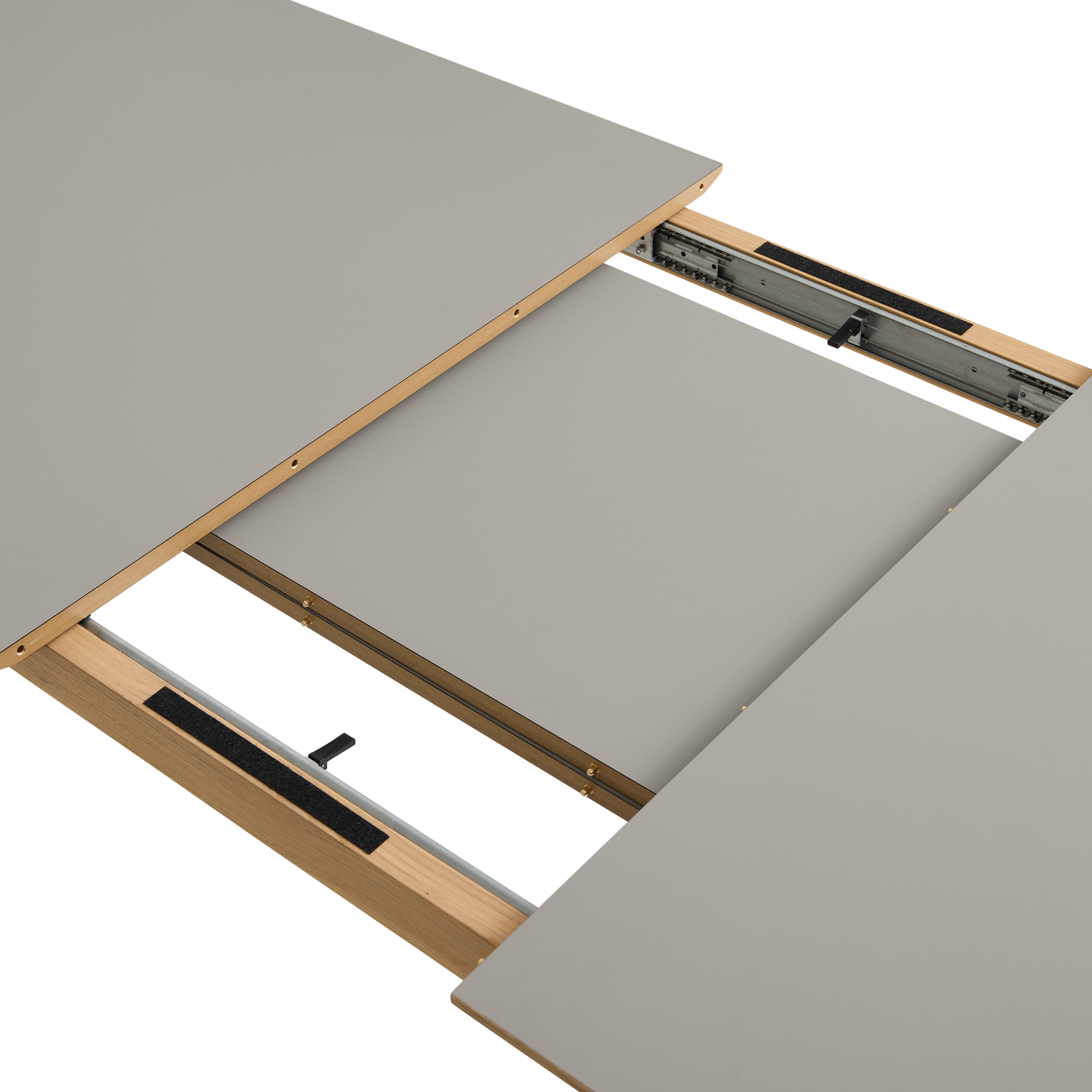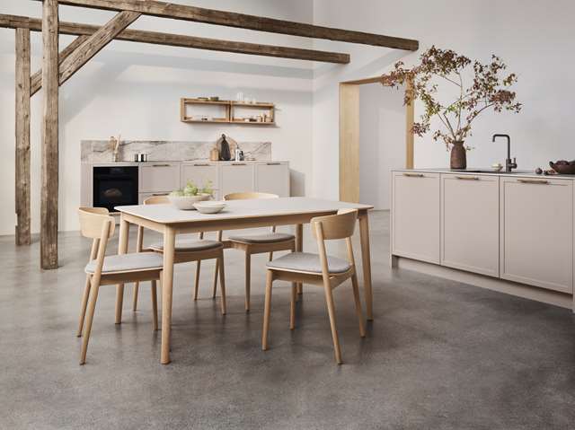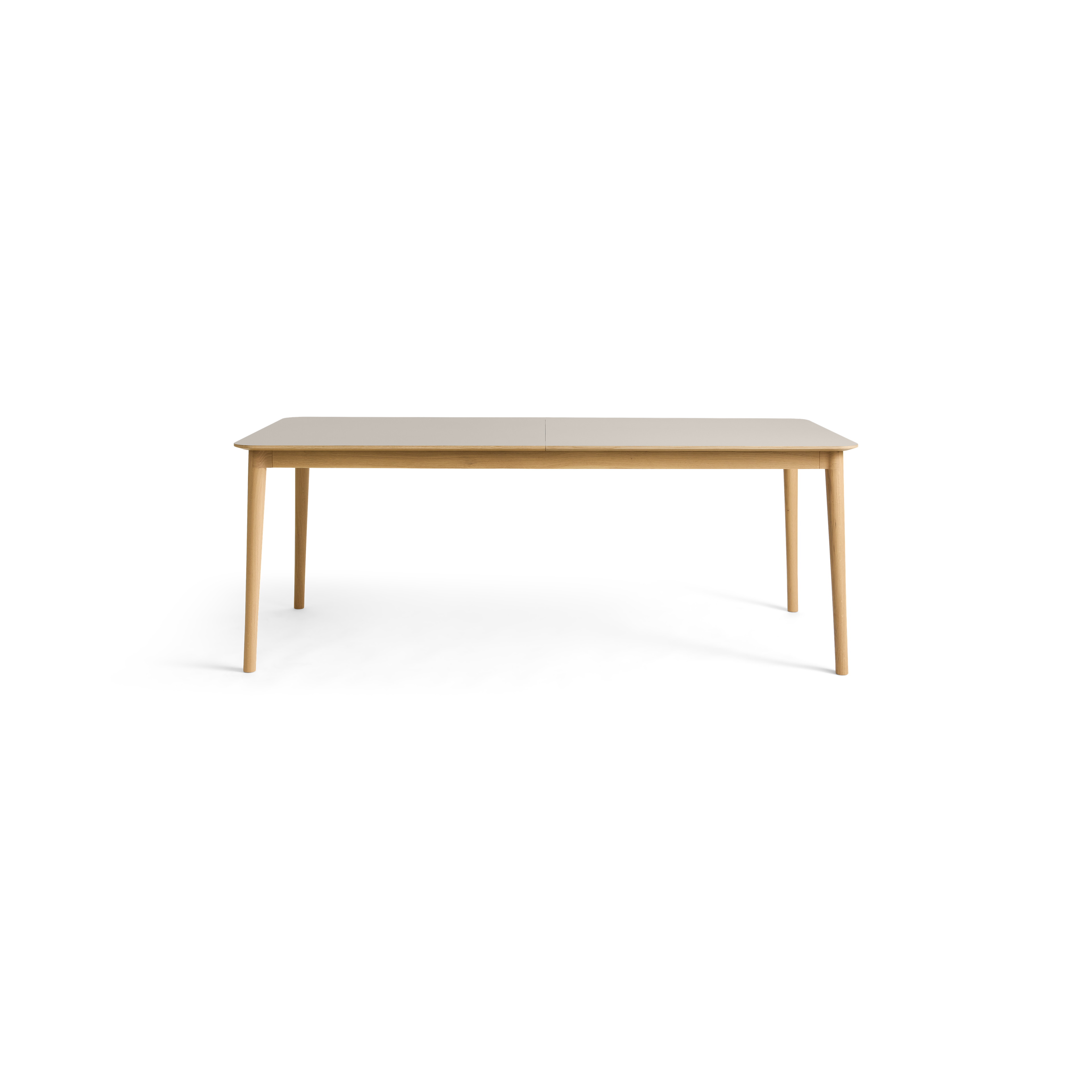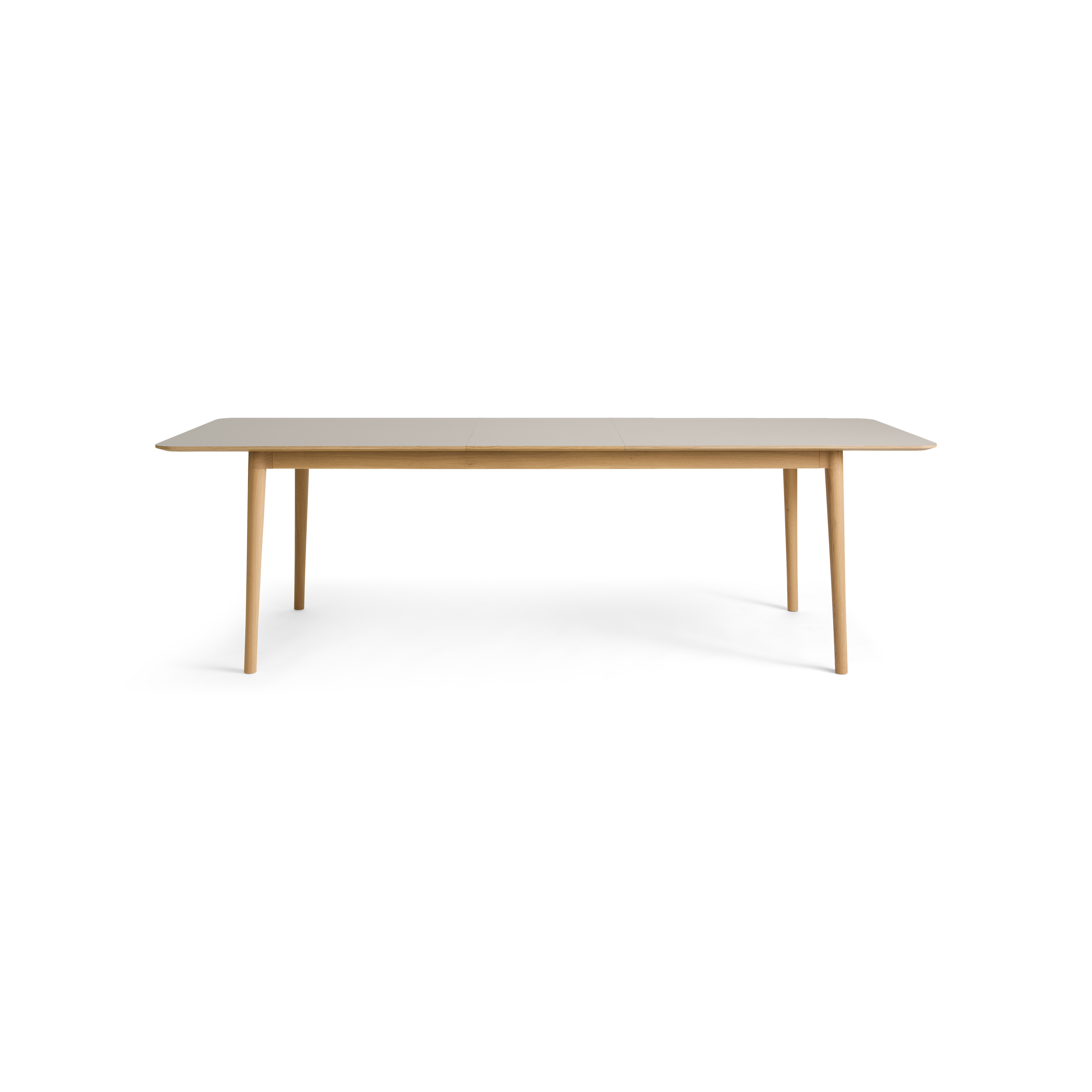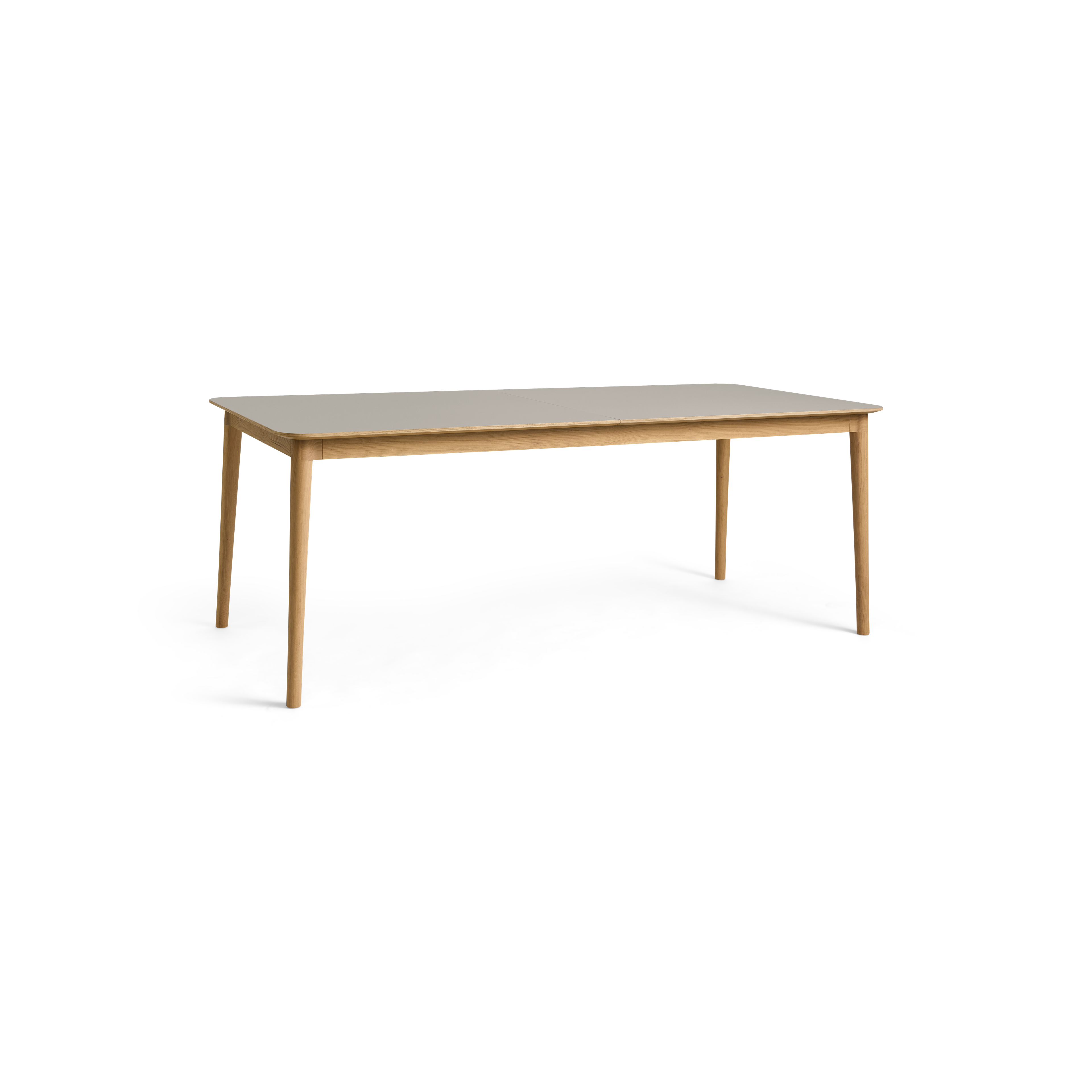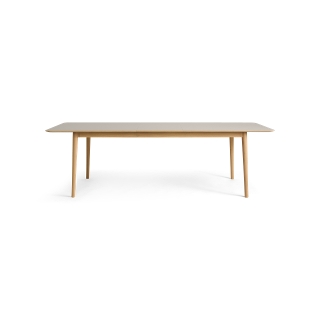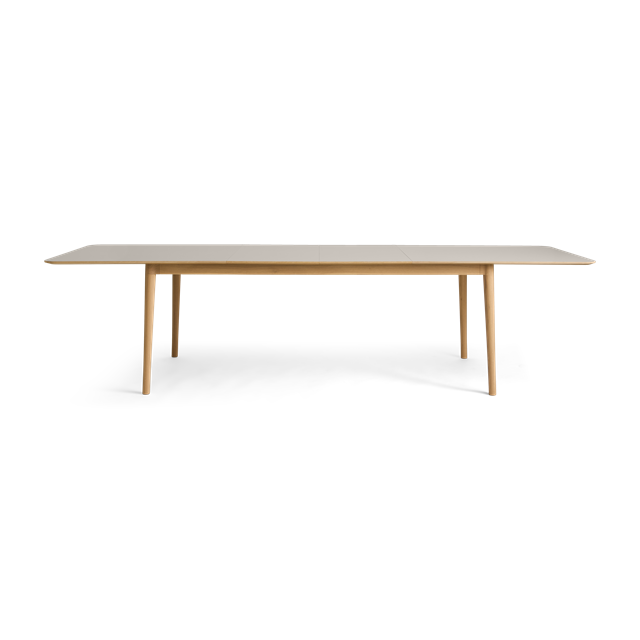 Hans Thyge & Co. har designat detta stiliga matbord med ett smart utdragssystem. Bordet har rundade hörn och vackra, hantverksmässiga detaljer. De lätt lutande benen och den starka bordstommen i ek ger bordet stor stabilitet och styrka. Utdragssystemet gör det möjligt att förlänga bordet med antingen 50 eller 100 cm utan att benens placering förändras eller står i vägen för de extra sittplatser som skapas. Systemet glider enkelt och smidigt, så att även en enda person kan klara av uppgiften. Tilläggsskivorna (tillval) förvaras diskret i en smal ficka under bordet, utan att kompromissa med benutrymmet. Ett mycket funktionellt matbord som fungerar perfekt i vardagen (6 pers.) och snabbt kan utvidgas för att rymma det stora sällskapet (10–12 pers.). Dessutom är färgvalen unika för detta bord. De matchar nämligen de populära sortimentsfärgerna på våra köksfronter. Det ger en unik möjlighet att skapa ett rum med en sammanhängande färgpalett. Den vackra bordstommen och bordsbenen är tillverkade i massiv ek, FSC®-certifierad. Bordsskivan är tillverkad i högkvalitativt Fenix® nanolaminat, vilket ger en ultramatt och slitstark yta. Levereras inklusive filtglidare av hög kvalitet.