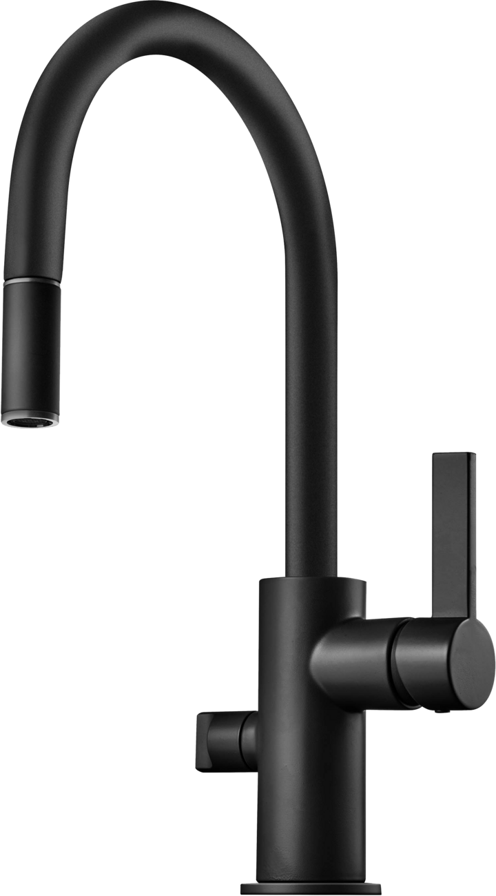Den mattsvarta finishen ger inte bara en touch av sofistikering till ditt kök utan säkerställer också långvarig hållbarhet. C-munstyckets design förbättrar vattenflödet, vilket gör vardagliga uppgifter som att diska eller fylla krukor mer effektiva. Med det medföljande monteringsbeslaget är installationen enkel, så att du kan njuta av din nya kran utan krångel.