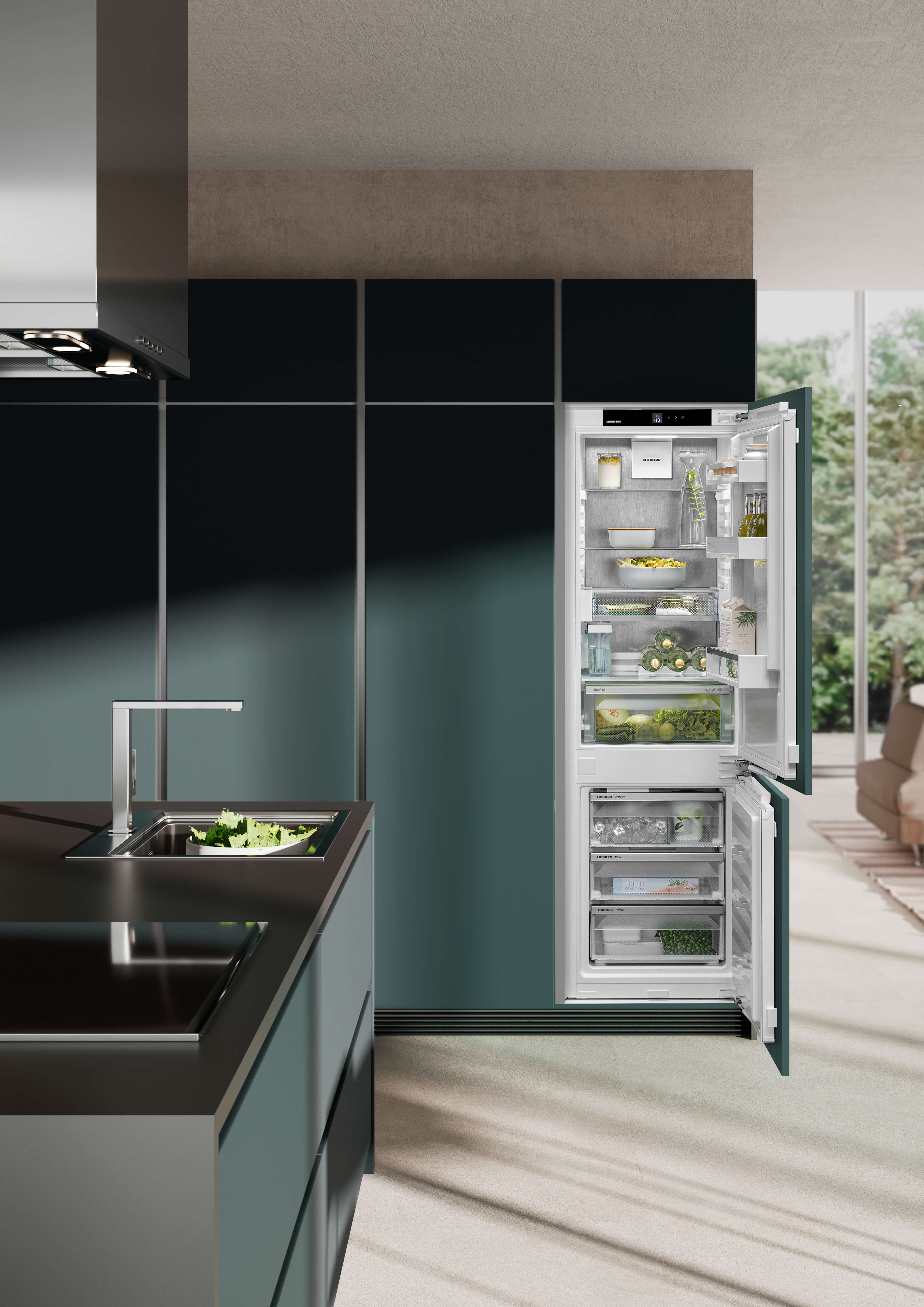 Bra överblick över matvarorna och maximalt utnyttjande av platsen. Varje apparat är noga genomtänkt in i minsta detalj. Dina fryspizzor kan till exempel placeras så att platsen används optimalt.