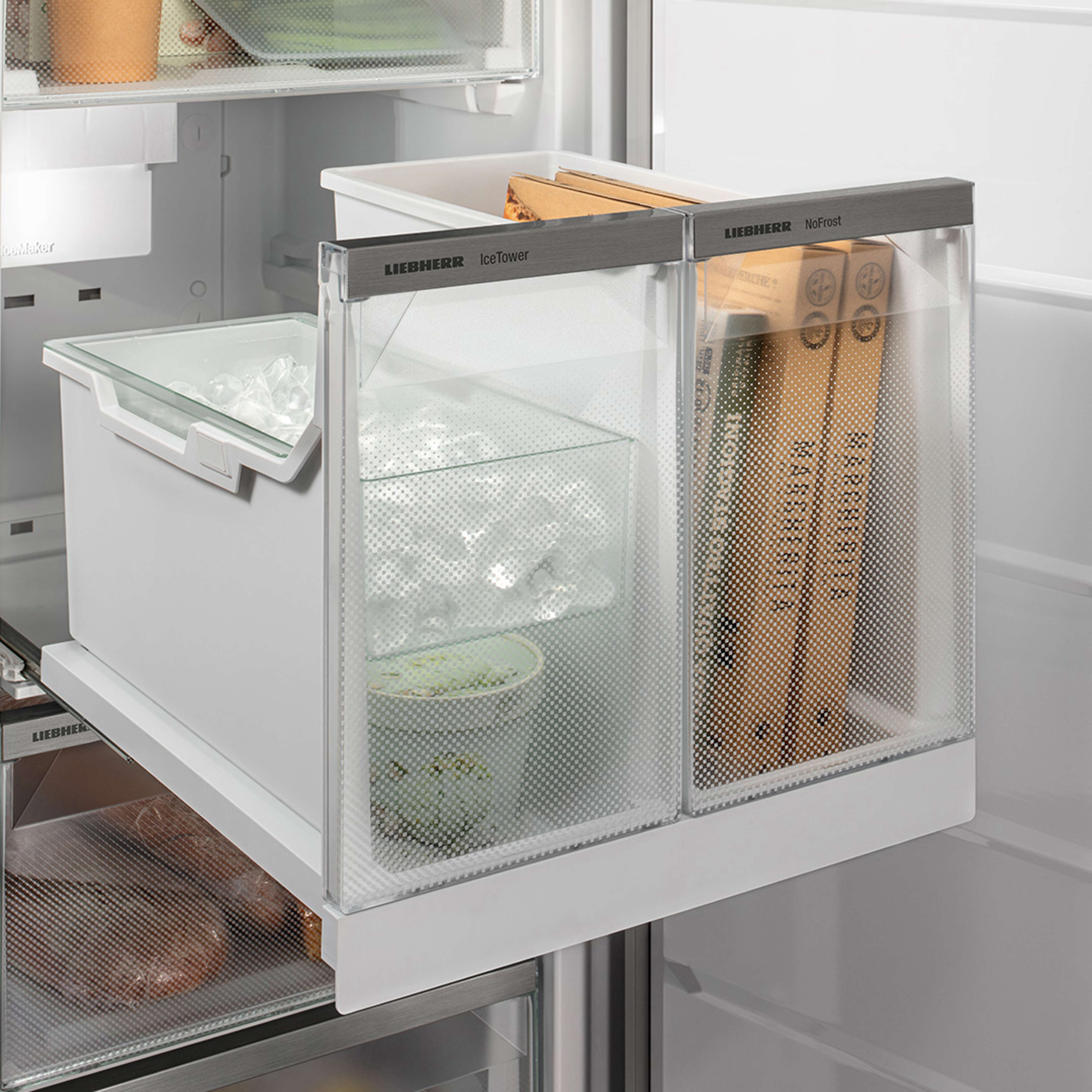 Med NoFrost-tekniken behöver du aldrig oroa dig för avfrostning. NoFrost löser det när det behövs. IceTower producerar och gör det möjligt att lagra upp till 5,7 kilo isbitar. De flexibla lådorna ger dig bra överblick över dina matvaror.